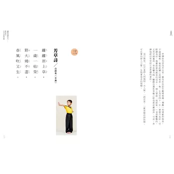 隨著三C產品發達,現代孩子坐在室內的時間愈來愈多,缺乏肢體伸展的機會與時間,實在是一件令人擔憂的事。任老師帶領孩子,一邊念唐詩,一邊練中國功夫,不但益智,又能健身,真是一舉兩得!本書以詳盡的圖文,讓爸爸媽媽可以隨時隨地帶著小孩,在家裡、去戶外,都可以健身喔!──陳安儀/親職作家
