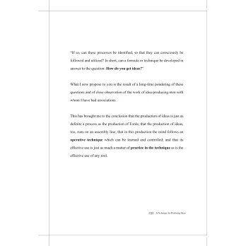 我很同意作者所提到的,創意生產誠然是一門藝術。因此,我們最應該要學習的並不是到哪裡去尋找特定的靈感,而是如何訓練心智熟稔創意生產的方法,並且要能夠充分掌握所有創意背後的基本原則。