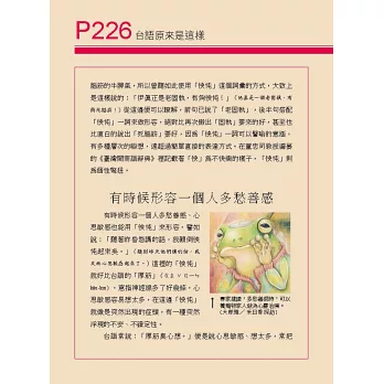 本書除了收錄台語詞彙的典故考證、釋義、沿用例句與小道消息外,