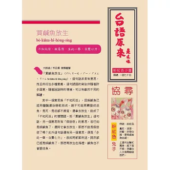 原來,在半世紀的苦悶之後,台語的復興運動已經於年輕世代間悄悄開始…這本《台語原來是這樣》引領我們坐上了時光機,為每一個脫口而出的台語詞解開"身世之謎"。也許在學術上仍需考究,但解謎的過程裏,我們已經充份感受到,啊~台語果然是台灣製造且融合了各種文化的可愛產物。