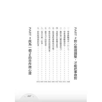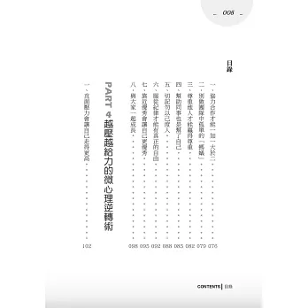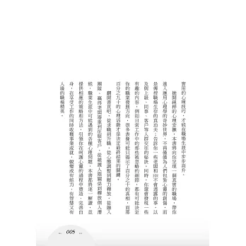 翻開書頁吧,從求職到升職,從心態調整到壓力釋放,從融入團隊、贏得老闆器重到征服客戶,從維護人際關係到釋放個人潛能,職業生涯中可能遇到的各種心理問題,本書都將逐一解讀,並提供相應的策略和方法,引領你在呵護心靈的過程中塑造、完善自身,在享受工作的同時收穫事業成就,蛻變成有能力、有智慧又有人緣的職場精英。