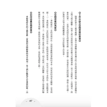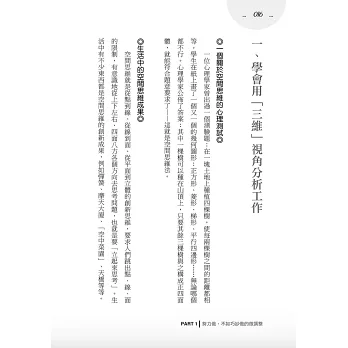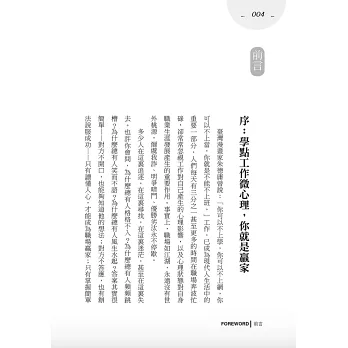 拋開純粹的心理安撫,本書將向你呈現一個真實的職場,帶你進入應用心理學的奇妙世界,不再僅僅為人們包紮心靈的創傷,而是傳授職場生存的真功夫;告訴你一些老闆和HR不會透露的事,以及與上級、同事、客戶等人群交往的秘訣。同時,你還會發現一些有趣的內容,例如日常工作中的那些被忽略的細節,都有可能決定你的職業發展方向,很多表像可能只揭示了百分之十的真相,而那百分之九十的心理活動才是決定最終結果的關鍵。