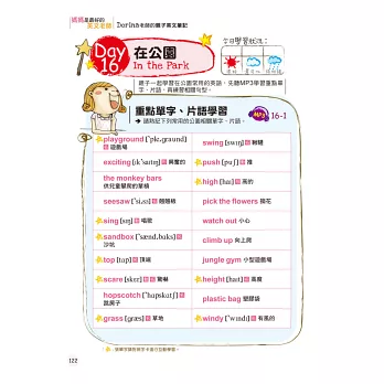 媽媽請先瀏覽所有句子情境,先聆聽一遍MP3,再逐句引導孩子跟著唸。接下來,媽媽和孩子都不要看書,試著隨機進行會話練習。