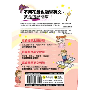 我現在是一位全職的家庭主婦,育有二個小孩。我一直在找一套能夠幫助孩子學好英文的書,可是死板板的書完全無法激起孩子的學習慾望。在看了這本書後,我覺得──就是它了!裡面分了很多不同的主題,都是生活中非常實用的,搭配書中的歌謠MP3,孩子每天都吵著要聽呢!另外,裡面還附上字卡,可以讓小朋友互相比賽,增加記憶力!