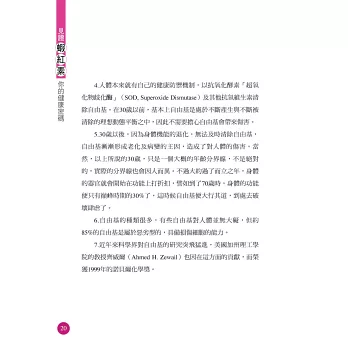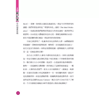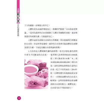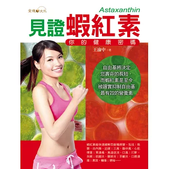 蝦紅素目前在日本及美國都非常風行,正確認識及補充蝦紅素,將徹底為我們的身體建立起一個保護網,讓細胞有優良的成長平台,進而達到健康長壽的目標。不論您的年齡多大,都能從書中獲取對健康有益的重要信息,從而為自己的健康長壽做好準備。
