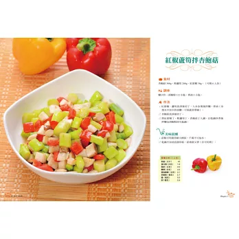 本書「Chapter1 從3道菜入門」、「Chapter3低卡輕食」,教你用常見食材,不費太多時間,讓你親近做菜的氣氛,完成一道道有成就感的佳餚,在家就能輕鬆上手,安心吃到營養與美味!
