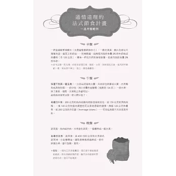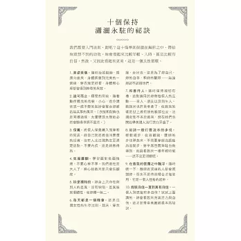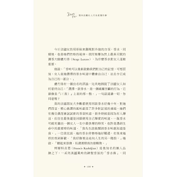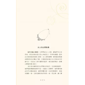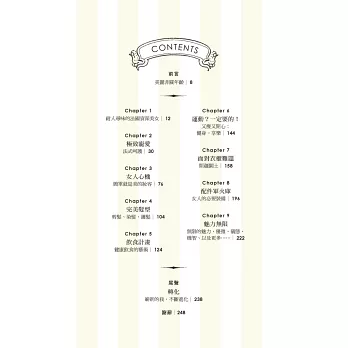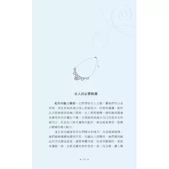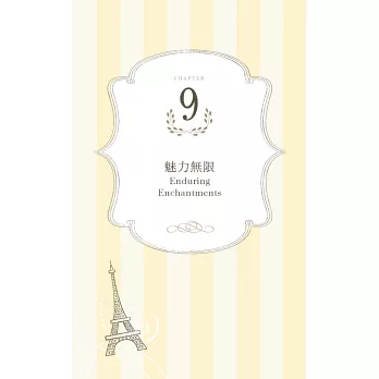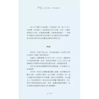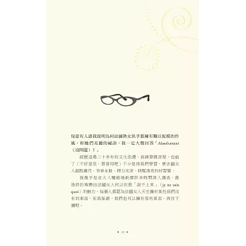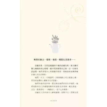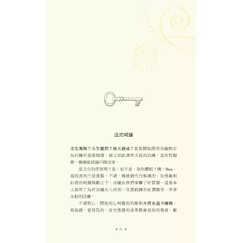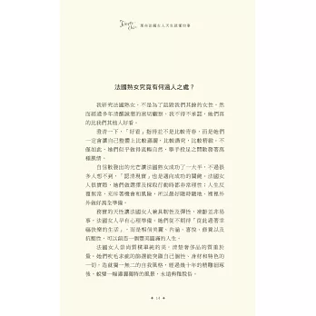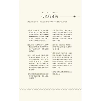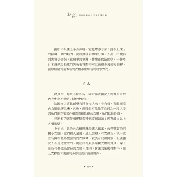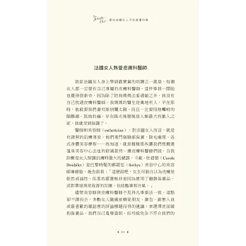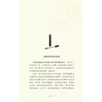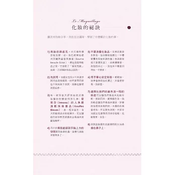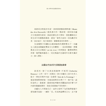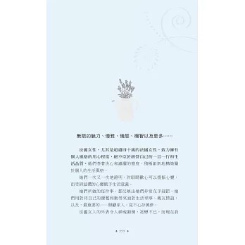 說真的,擦上厚厚一層乳霜,去沙龍洗個頭髮,拍點兒蜜粉,再噴一點喜愛的香水,妳是不是感覺好多了?妳很忙,我知道,法國女人也很忙,她們並不是天生就比較美,而是把寵愛自己放在第一順位。投資一個快樂的自己,才能帶給身旁的人快樂,法國女人堅持守住一切能讓自己充滿魔力的細節:健康的肌膚、完美的髮色、自然的妝容、節制但愉快的飲食、規律的戶外活動、有計畫的購物,還有,一顆達觀積極、好奇上進的心。