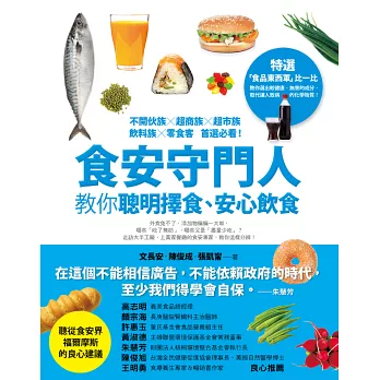 翻閱本書,我覺得作者像福爾摩斯、像柯南,他們把日常生活會遇到的食品添加物細細分解,再用最貼近大眾的語彙,抽絲剝繭的引導讀者了解哪裡是可能的問題點。讀通這本《食安守門人教你聰明擇食,安心飲食》,讀者就算不能升堂問案,至少能知道發生了甚麼事。在這個不能相信廣告,不能依賴政府的時代,至少我們得學會自保。