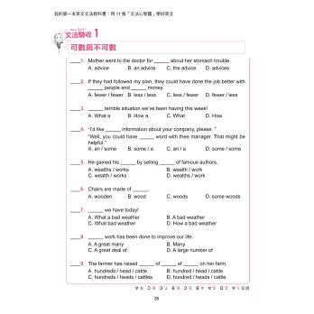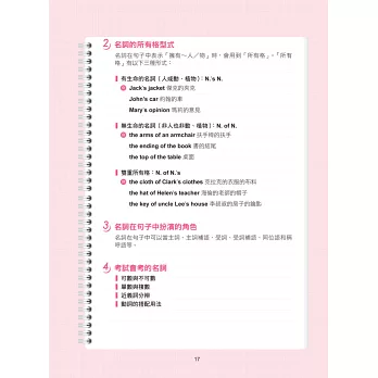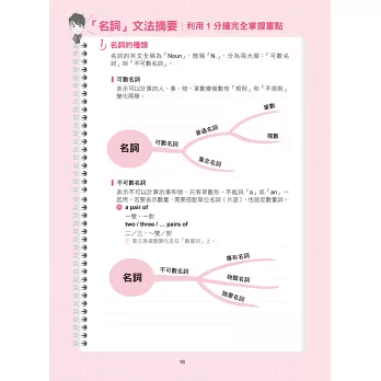 作者們針對不同單元繪製專屬的「文法心智圖」,讓學習者能一目瞭然該章所學的重點內容。讓原本枯燥乏味的英文文法,因「文法心智圖」的出現,替文法增添些許學習中的小亮點。