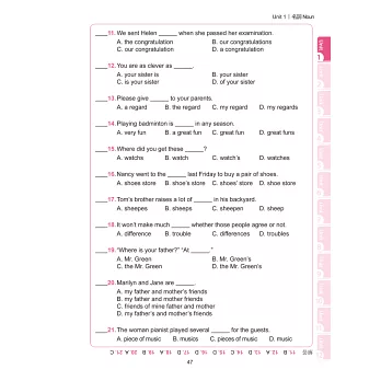 熟習每一個單元內容後,該是驗收學習效果的時候到了!完成練習題,馬上確認解答,能否進階下一個關卡,就看這一次!若遇到無解的題目時,趕緊翻閱至相關的文法內容,再次深刻的複習。