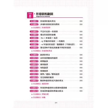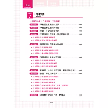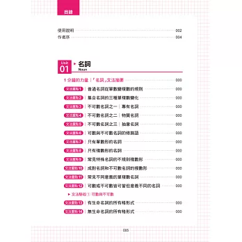 全書文法依重要性順序編排,包含:名詞、代名詞、冠詞、動詞、可單獨使用的助動詞、假設語氣、準動詞、形容詞和副詞、介系詞、連接詞、數量詞……等。學習者可以依照程度或想加強的內容來挑選合適的章節,安排屬於自己的讀書進度表。