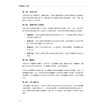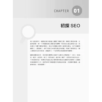 在網站架設越來越容易的今天,如何從眾多的網站中脫穎而出,搜尋引擎最佳化(SEO)就成了一門必修的功課。本書目前主流的搜尋引擎行銷方式開始談起,解決搜尋引擎工作原理,然後分別就關鍵字、URL、程式碼、圖片、網頁結構、伺服器選擇等各環節進行分析解說,協助您搞懂SEO,為您的網站創造更多的可能與商機。