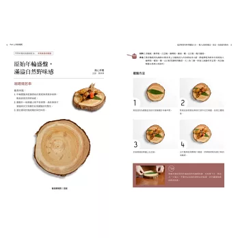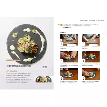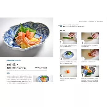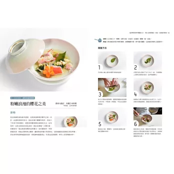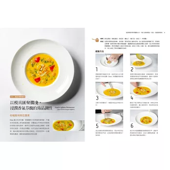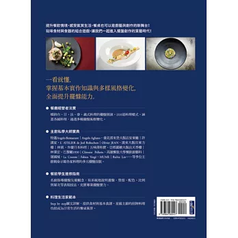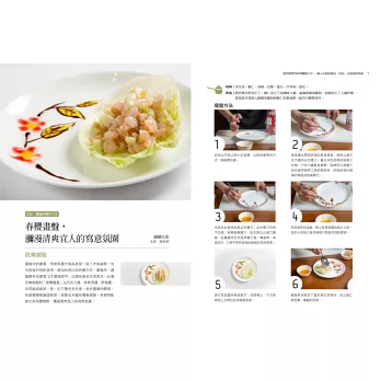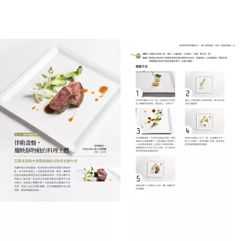 基本食材與簡易食譜範例;每道料理並有step by step完整圖解步驟演示,提示擺盤呈現的操作重點,在家也能實現飯店名廚的招牌好菜!