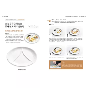 針對食材與食器的搭配進行分析,順應食器特色,進行料理與擺盤變化,不論是經典常見的大眾食器、風格獨特的精緻食器,或者是多件式的食器組合變化,都可在此找到最適宜的擺盤應用建議。