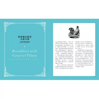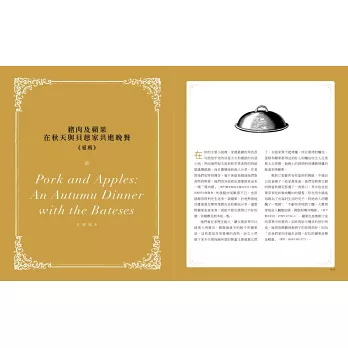 書內穿插了數篇簡明扼要的趣味短文,每篇食譜前皆節錄奧斯汀小說或書信片段,隱然勾勒出一幅以飲食為主角的英國鄉紳生活風情畫,讀者在廚房大展身手之餘,也能一窺當時的人如何煮食用餐、操持家務、訪友送禮等生活細節。