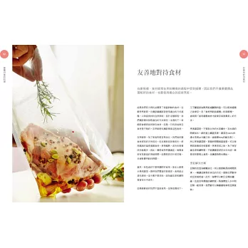 本書分為兩大部分:第1部分為基本概念,共6個章節;第2部分為食譜實作,共2個章節。在實用的基本概念中,從食品營養、廚房組織、食材、工具,以及醃製、浸泡、保存等預煮技術,鉅細靡遺地說明這些料理周邊的實用細節所應有的實際規劃,並且再針對每個項目帶入相應的料理食譜,提供實際的運用理解。
