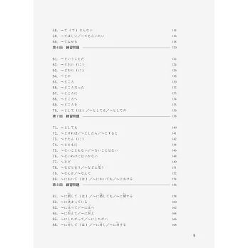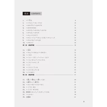 本書針對日本語能力測驗N3文法常考的138組文法句型加以解說分析其接續用法、意思等,並收錄實用例句作為補充。此外,意思相近或字形相似的文法,另外也統整出類義表現、慣用句,更能讓學習者釐清相似文法的使用技巧。全書例句皆附中文翻譯,另有14回練習題及1回綜合測驗(含解答),以供學習者測試自我實力之用。
