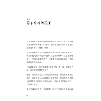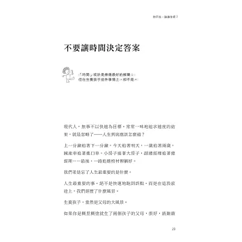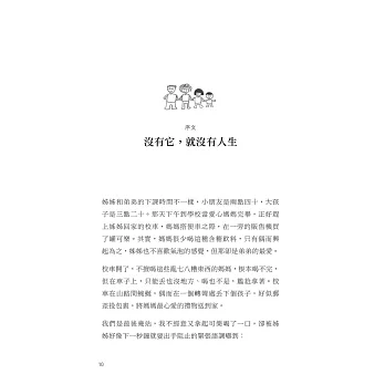 我是留職停薪回家帶孩子的媽媽,原以為,孩子大一點就可以回到喜愛的工作崗位。現在,大的國一,小的小三,夠大了吧。可是我不想回去了。他們有媽媽的陪伴覺得很開心,我也把自己的生活過得很開心。雖然經濟不是很優渥,開的車很小,也不能出國度假,但是,卻跟孩子有很好的精神交流。看完你的書,更讓我覺得自己的抉擇是對的。謝謝。──ROSE