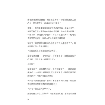 聽到有媽媽說不敢看這本書。讓我雞婆一下,汪老師的書沒這麼可怕啦。好像看了會給自己太多壓力似的,想太多了。抱著單純的心去看這本書,會幫你釐清更多的思維和方向喔。老師也提到了只生一個孩子的問題,其中一篇「只生一個的xx方法」,不妨仔細看完老師的書吧。──Joyce