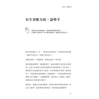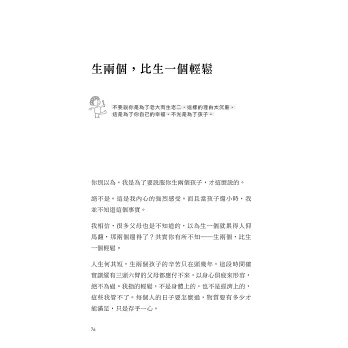 看完老師這本書,覺得自己選擇生了兩個孩子,真的沒有錯。在剛組織家庭時,和先生已有共識,一是一個也不生,一生就要生兩個。但生完姊姊後,我就不太希望生第二個,因為懷孕期間狀況不好,我真怕了。所以,當知道自己再懷孕,簡直有種晴天霹靂的感覺!不過既然上帝要我再生一個,那唯有硬著頭皮頂下去,生下來好好愛他來安慰自己吧!