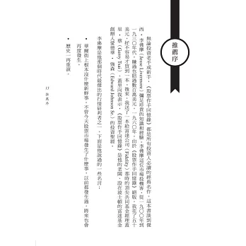 無論投資老手或新手,《股票作手回憶錄》都是所有投資人必讀的經典名作。這本書談到傑西‧李佛摩(Jesse Livermore)彌足珍貴的知識和經驗。李佛摩這位市場投機客,從一九00年到一九三0年代,賺過也賠過數百萬美元。一九六0年,由於《股票作手回憶錄》絕版,我花了五十美元,好不容易才買到一本。後來,我送了一本給富達公司(Fidelity)那時的頂尖共同基金經理蓋里‧蔡(Gerry Tsai)。蓋里向我表示,《股票作手回憶錄》是他的老闆、設在波士頓的富達基金創辦人愛德華‧強森(Edward Johnson Sr.)的投資聖經。