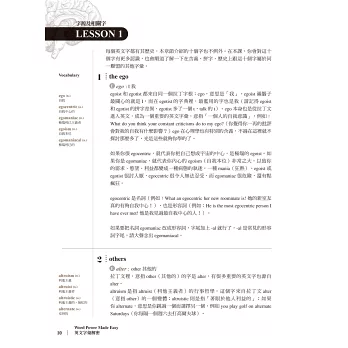 一旦你學會了 ego 這個字根,就能快速學習所有從這個字根延伸而出的字彙:egocentric, egomaniac, egoist, 以及alter ego。很快的,你就可以辨認時代雜誌上所有不熟悉的字眼了。