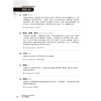 因此,在每個章節的開頭,我們會先介紹一些 IDEAS「概念」——諸如性格、醫生、科學、各行各業……等,並接著檢視十個關於此概念的核心字彙。
