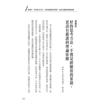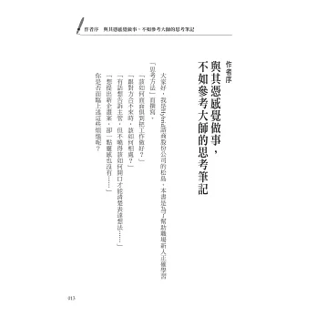因此作者為了解決即將陷入困境中的工作者,所以提出了16個解決方法,並且用他的親身經驗、故事、及大師的論點,讓讀者能把本書當成基礎參考書,最後還能內化成自己的思考模式並加以實踐。