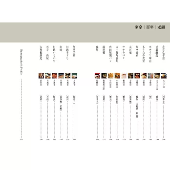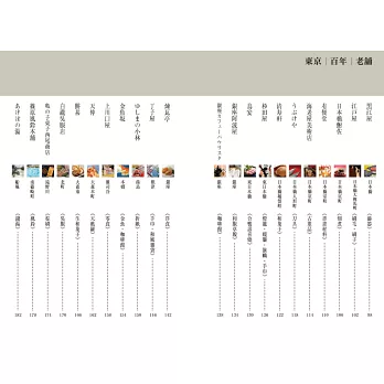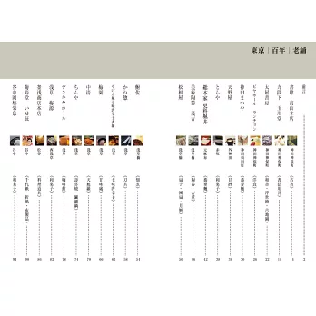 「東京百年老舖」集合了60間東京近郊創業百年老舖,以照片記錄老店的樣貌,以文字敘述老字號的驕傲、傳統帶來的壓力、如何瞬息萬變的時代潮流衝擊下集合了60家東京百年老舖的故事。這裡面的故事說著的是:老字號的驕傲、傳統帶來的壓力、瞬息萬變的時代潮流、百年歷史的集大成。自創業開始,世世代代從錯誤中學習,才走到了今天。為了回應這一步一腳印建立起的信賴,努力之路,沒有終點。本書為紀錄位於東京近郊創業百年之老舖的寫真書。
