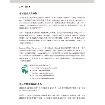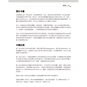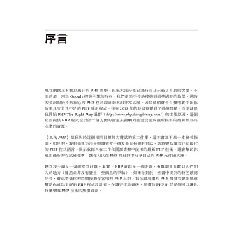 作者Josh Lockhart(以推廣PHP最佳實作方式為目的的PHP The Right Way的創始者),用行動揭露出新的語言特點,你會學習到應用程式架構和規劃、資料庫、安全性、測試、除錯和佈署的最佳習慣,如果你對於PHP有基本的認識並且想加深技巧,那這本書正是為你而寫的。