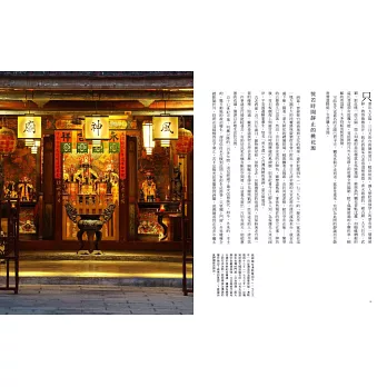 ‧內容收錄300餘張全新拍攝照片,主題涵蓋古蹟、巷弄、廟宇、慶典、農田、台江、市街、鄉親,從不同角度詮釋,每翻一張都能強烈感受到巨大的寧靜,影像藝術造詣再創巔峰。