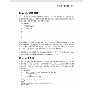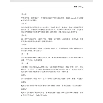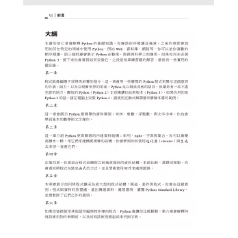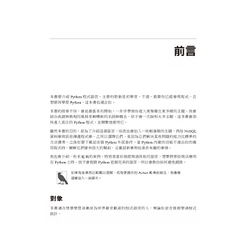 你將會紮下這個語言的深厚基礎,包括測試、除錯、程式重複使用的最佳做法以及其他開發技巧。本書也會告訴你如何藉由各種 Python 工具與開放原始碼套件,於商業、科學及藝術領域應用程式中使用 Python。