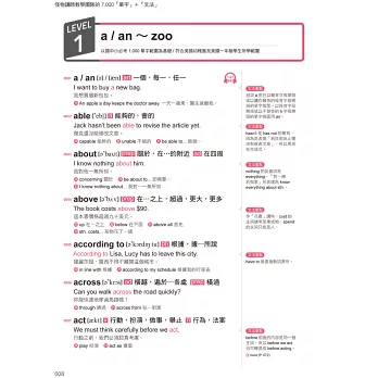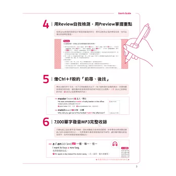 單字皆標是音標、詞性、中文字義,並視考試重要性補充同反義字、片語、句型、使用重點、文法等,延伸式的學習能幫助讀者記憶,不僅節省額外背誦的時間,更能培養活用的能力。