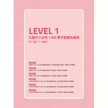 本書共分成6個Level,單字、例句、各種補充的難易度皆依Level代表的能力程度來量身打造。只要用心讀完全書,英文成績便能從底標變頂標,英文考試成績滿級分更不是夢想!