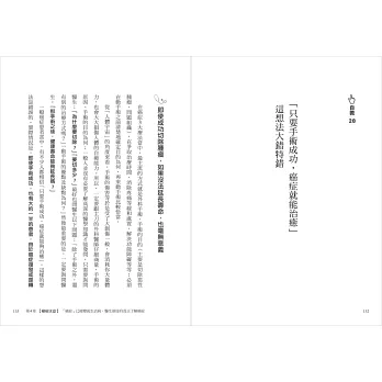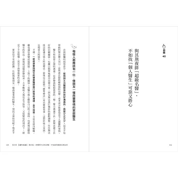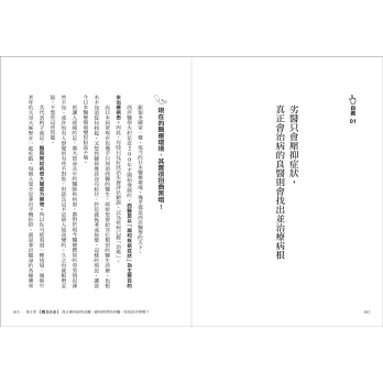 所謂「治療疾病」,其實就應該是這樣的觀念。所以,一個「真正會治病的醫生」,就必須告知患者醫病的真正方向才行;民眾更要從這些方向要領,來判斷選擇一個「對的」、「真正會治病」的醫生,才是「無病更健康」的永續根本。而我寫這本書的目的,也是身為醫師的我要自我警惕,並希望對現今醫療體制敲響警鐘,大家一起努力做出改變,讓更多人能夠充滿活力度過健康的人生。