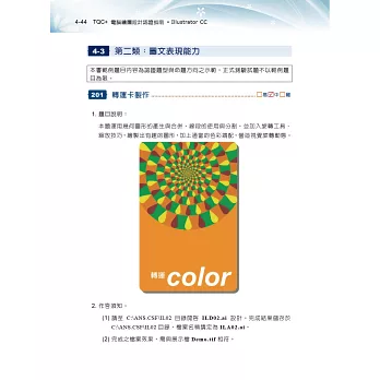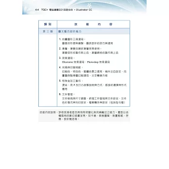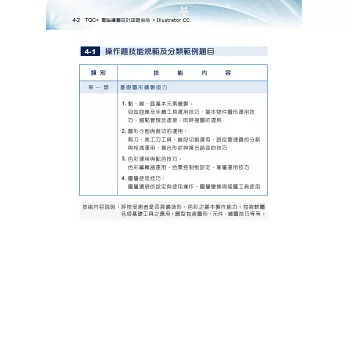TQC+ 專業設計人才認證,是財團法人中華民國電腦技能基金會(CSF)整合產官學研各界專家意見,為培育符合企業需求的設計人才、提升產業界設計能力所推動的專業認證。其中TQC+ 視傳設計領域的「電腦繪圖設計Illustrator」認證,從2010年CS4版本上市至今,獲得育才及用才單位一致好評,為Illustrator人才的評鑑建立了公正客觀的參考標準。此次搭配最新CC版本之推出,本會再次召開技能規範修訂會議,整合國內設計領域學界與業界專家建議,將Illustrator的應用技能及設計必備概念調整成「基礎圖形繪製能力」、「圖文表現能力」、「圖文整合設計能力」及「圖文應用能力」等四大類,每一類別提供10個範例題目。此等範例係由專家精心設計,讀者可藉由本書提供的範例題目,演練Illustrator CC最實用的技巧,提升電腦繪圖設計能力。建議讀者在練習之後報考本會TQC+ 專業設計人才認證,取得「視傳設計」領域最具公信力的電腦繪圖設計證照,為個人專業職能加分。