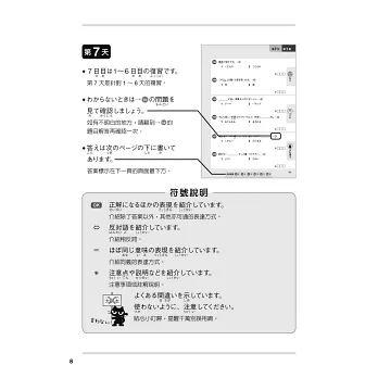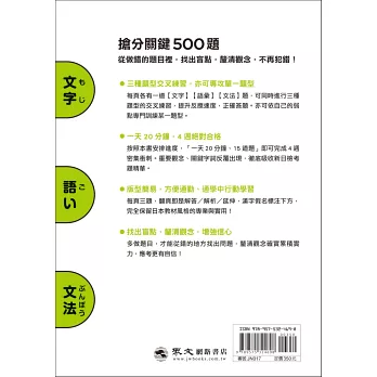 按照本書安排進度,「一天20分鐘、15道題」即可完成4週密集衝刺。重要觀念、關鍵字詞反覆出現,徹底吸收新日檢考題精華。