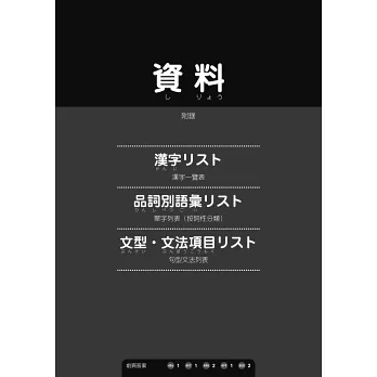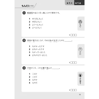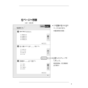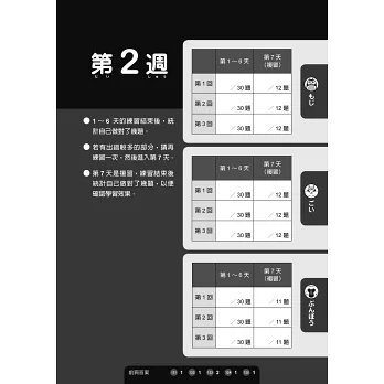 每頁各有一道「文字」「語彙」「文法」題,可同時進行三種題型的交叉練習,提升反應速度,正確答題。亦可針對自己的弱點專門訓練某一題型。