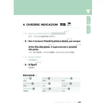 整理出義大利人日常生活中最常用的會話例句,每句皆有中文翻譯,再搭配「套進去說說看」代換補充字彙練習,讓你現學現說好實用!