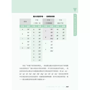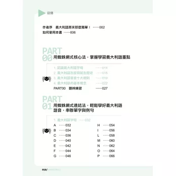 接下來進入最主要的傳統義大利語二十一個字母+五個外來字母學習。在這個單元中,作者除了說明字母的音標外,還標示每一個字母的隸屬音,每個字母皆提供六個單字、六個例句,經由蜘蛛網般的脈絡串聯起來,一線連結一線,結合成綿密的學習網絡,讓你同步學習字母、單字、例句。