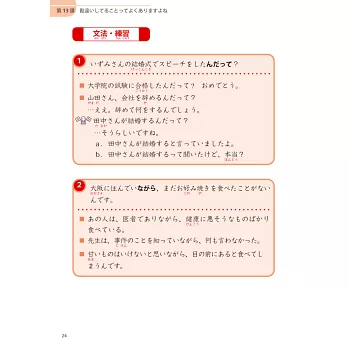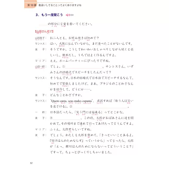 ◎碰到新文法,先透過「例句」思考此句型運用在何種場合,並確實理解文法的含義及接續型態為何。可先仿照課本「例句」兩兩練習,並試著延伸會話情境。