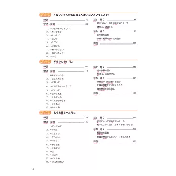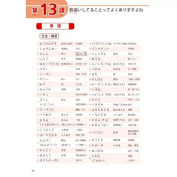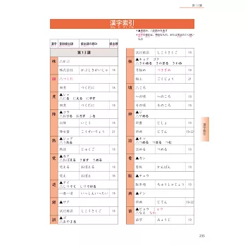 本書最後,將書中出現的詞彙、漢字、會話表現等學習項目加以分類整理。