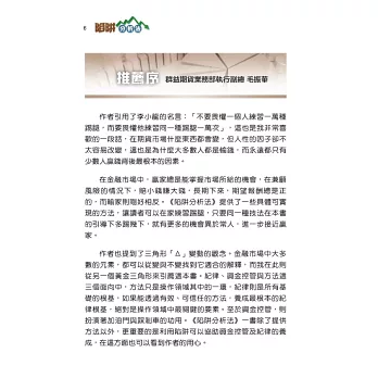 如果想要特立獨行、鶴立雞群,就要從觀念、邏輯著手。《陷阱分析法》一書從很多不同的角度,配合精采的案例分析,藉由歷史回溯了解陷阱、分析陷阱,是一本別樹一格、有別於傳統一般書藉而值得收納的金融書藉。