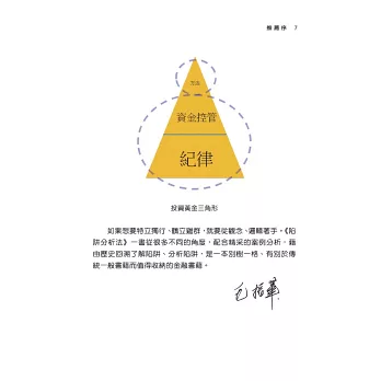 作者也提到了三角形「Δ」變動的觀念。金融市場中大多數的元素,都可以從變與不變找到它適合的解釋,而我在此則從另一個黃金三角形來引薦這本書。紀律、資金控管與方法這三個面向中,方法只是操作領域其中的一環,紀律則是所有基礎的根基,如果能透過有效、可信任的方法,養成最根本的紀律根基,絕對是操作領域中最關鍵的要素。至於資金控管,則扮演著加油門與踩剎車的功用。《陷阱分析法》一書除了提供方法以外,更重要的是利用陷阱可以協助資金控管及紀律的養成,在這方面也可以看到作者的用心。