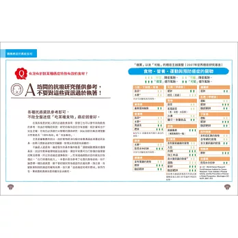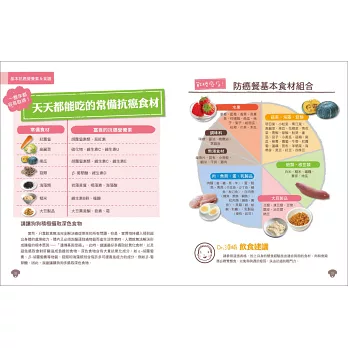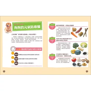 全書70種食材皆用表格說明,一眼就能看懂哪一種「天然食物」裡含有什麼「抗癌營養素」,再配合「2蔬菜+2穀類+2豆類+3肉類+1湯底」的比例,就能自行配菜!即使是平常不下廚的人,也能「快速選對好食材→輕鬆調配好比例」,做出健康美味的愛犬防癌餐。