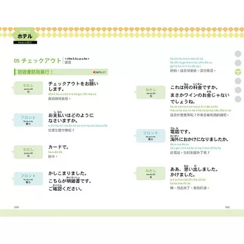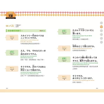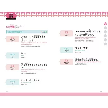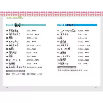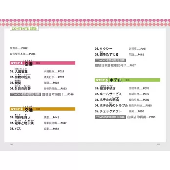 全書共分6大單元(機場、交通、飯店、觀光、美食、購物)45個場景,每場景又細分成3個環節: