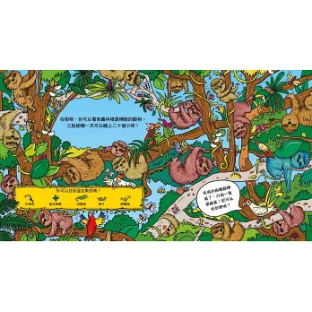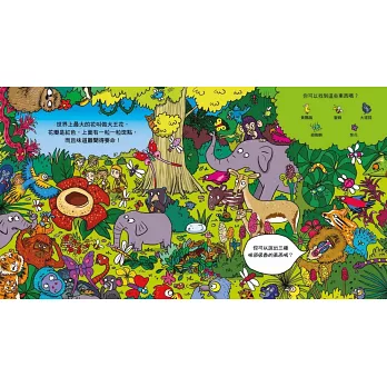 以好玩的的找找看活動,搭配寫實的叢林場景,讓本書每個跨頁同時具備教育性與啟發性。
