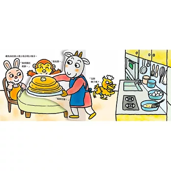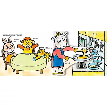 小讀者不但可以從《山羊蛋糕店》中認識各種甜點的名稱、想像好吃的蛋糕滋味,還能透過作者精心設計的翻翻頁玩扮演遊戲,化身甜點師傅和服務生,幫動物們煎鬆餅、切蛋糕捲,以及體驗烤蛋糕的過程。