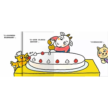 動物村裡新開了一間蛋糕店,有鬆餅、蛋糕捲,還有草莓生日蛋糕呢!透過有趣的軋型翻頁,一起體驗做蛋糕的樂趣吧!