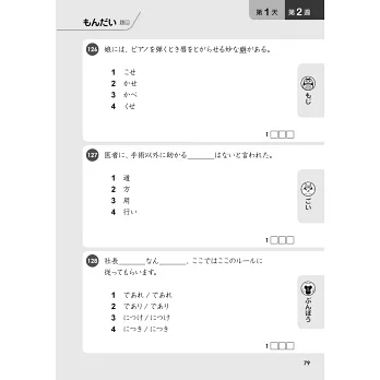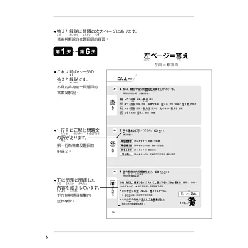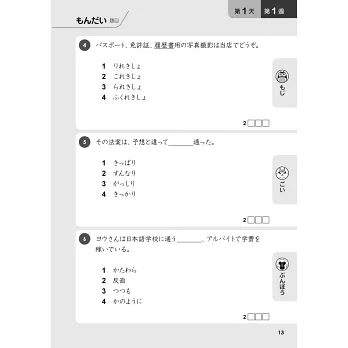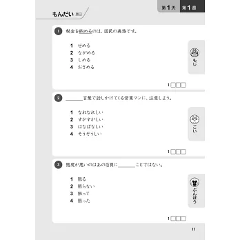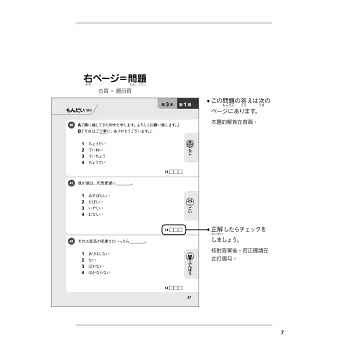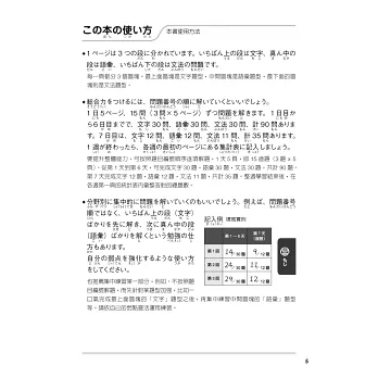 每頁各有一道「文字」「語彙」「文法」題,可同時進行三種題型的交叉練習,提升反應速度,正確答題。亦可針對自己的弱點專門訓練某一題型。